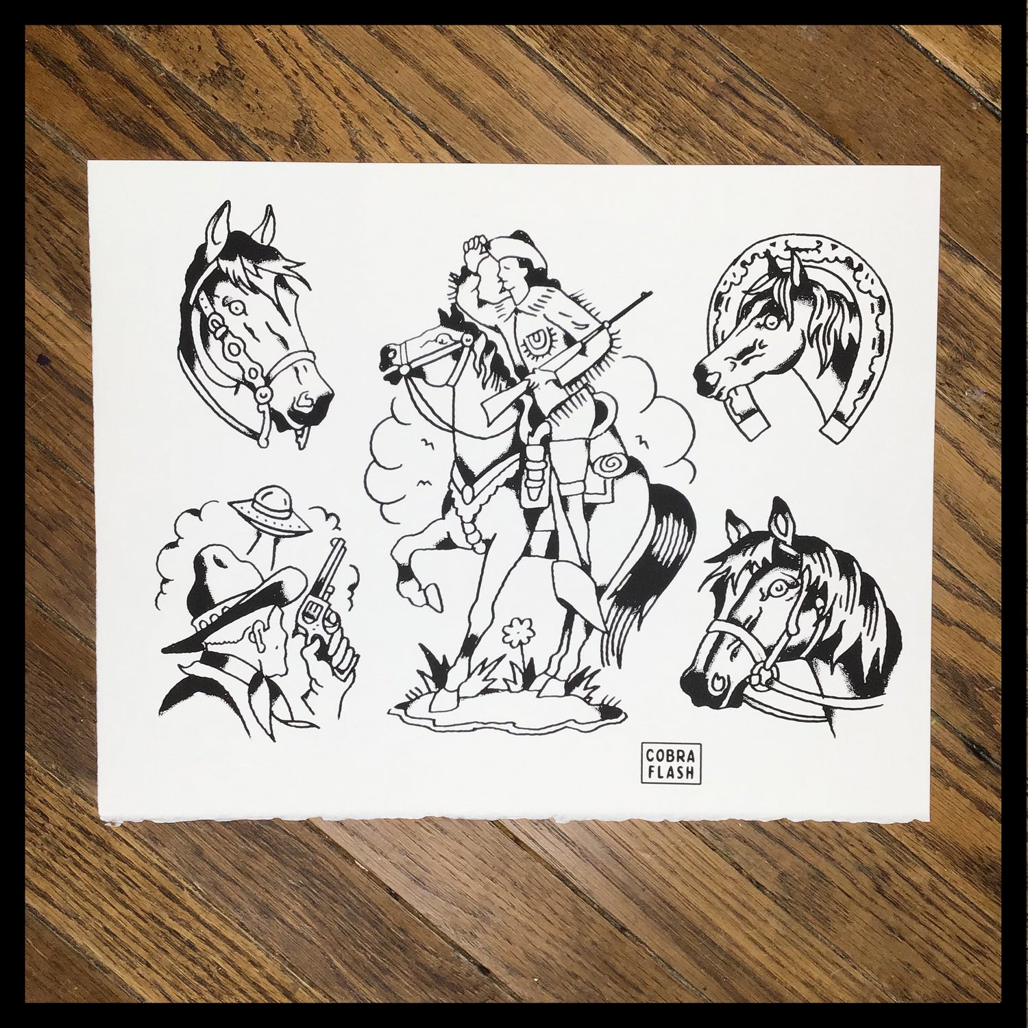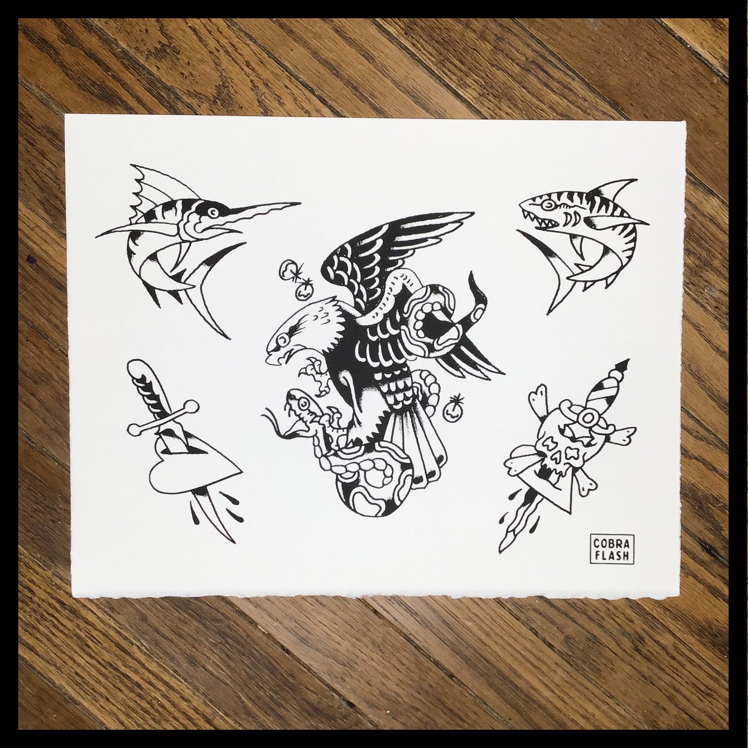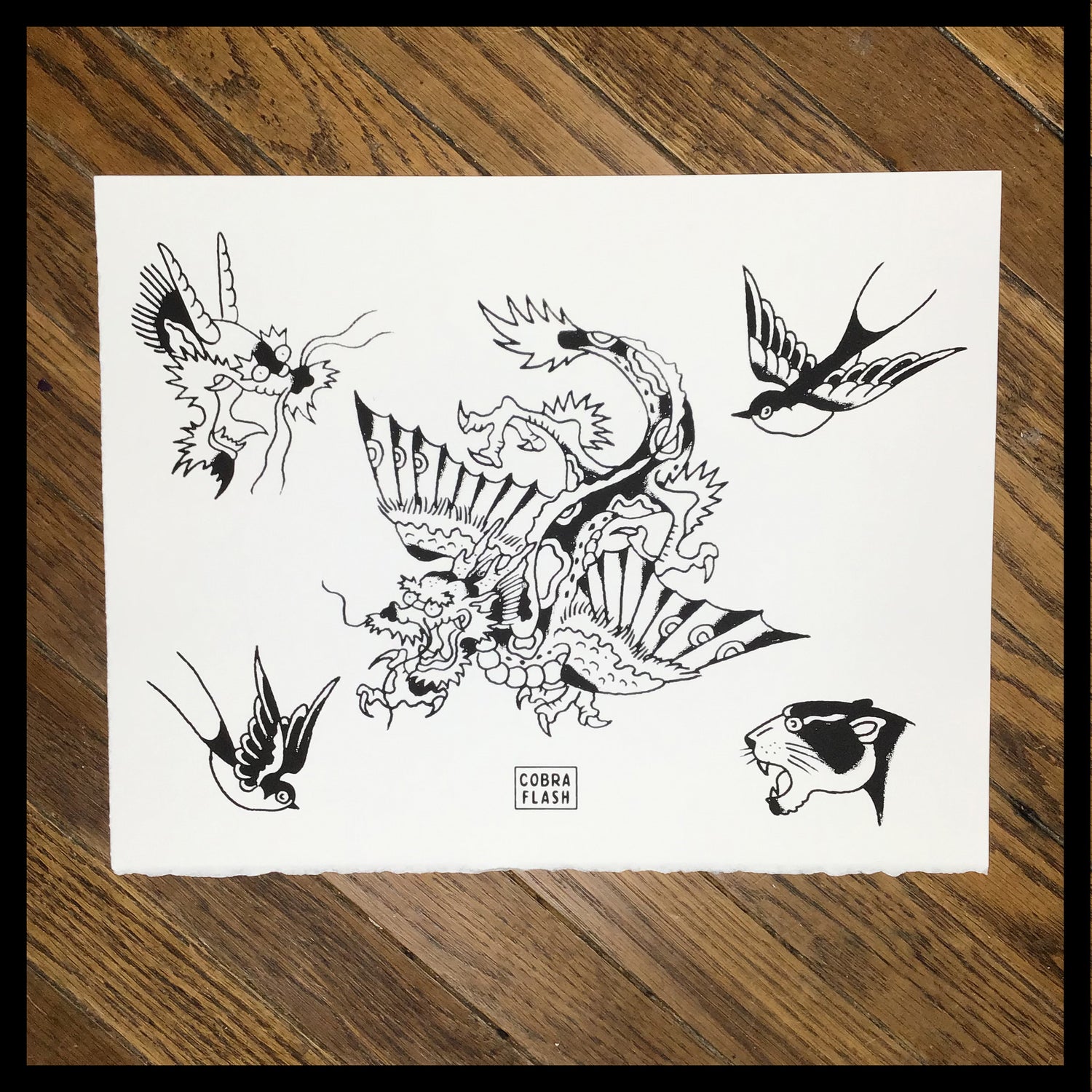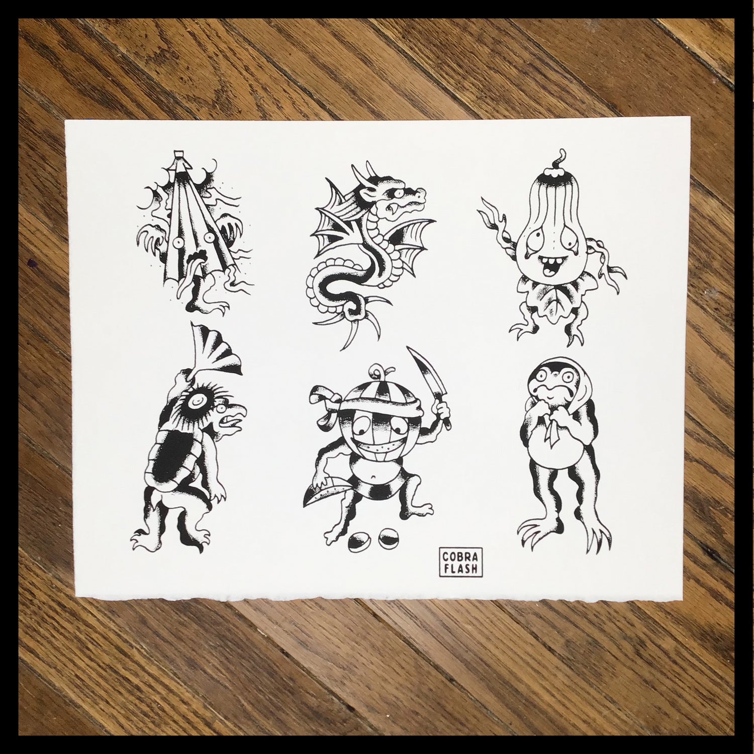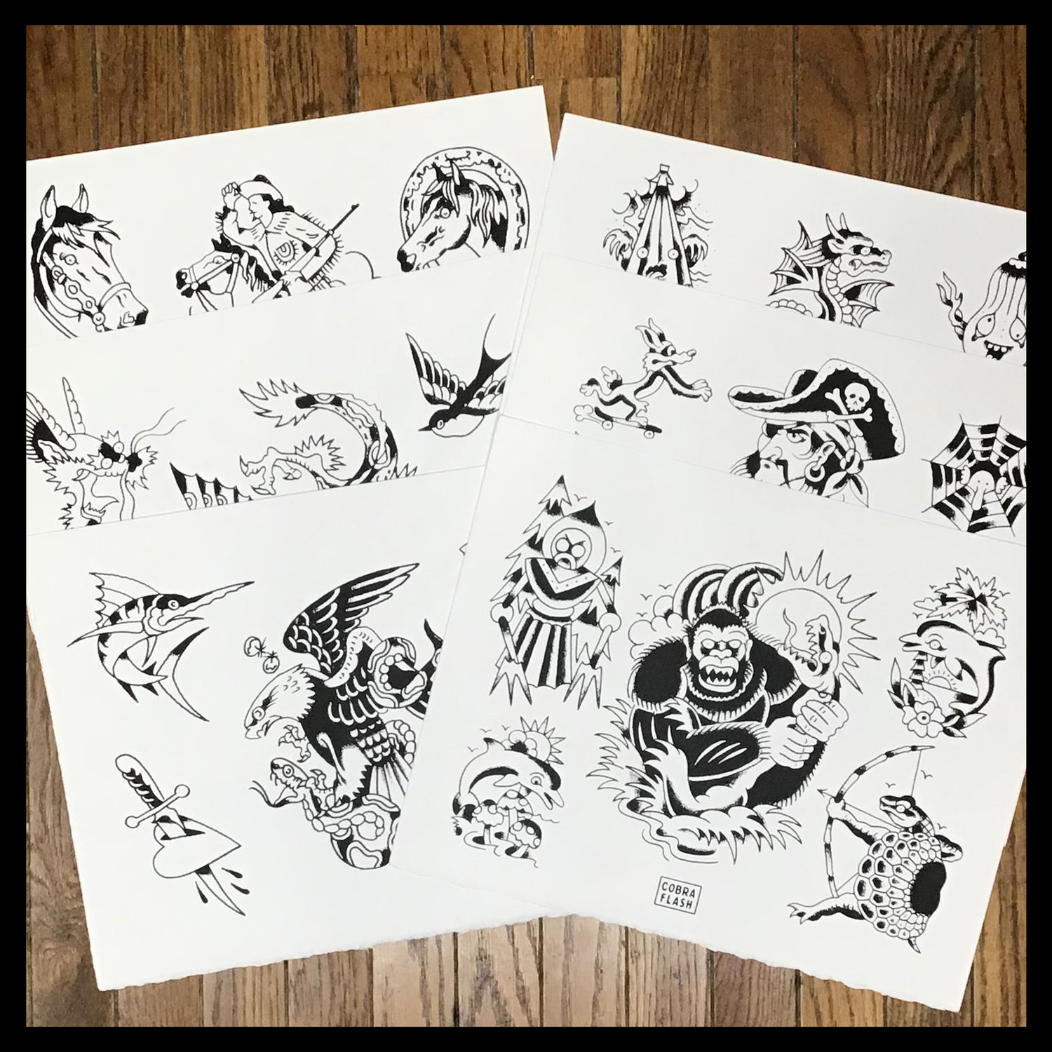 Each Set of Cobra Flash comes with six sheets of flash. Three designed by Timmy Tatts and three designed Lowercase j. Each sheet is an 11x14" hand-pulled screenprint on BFK Rives 250 gram, fine printmaking paper.