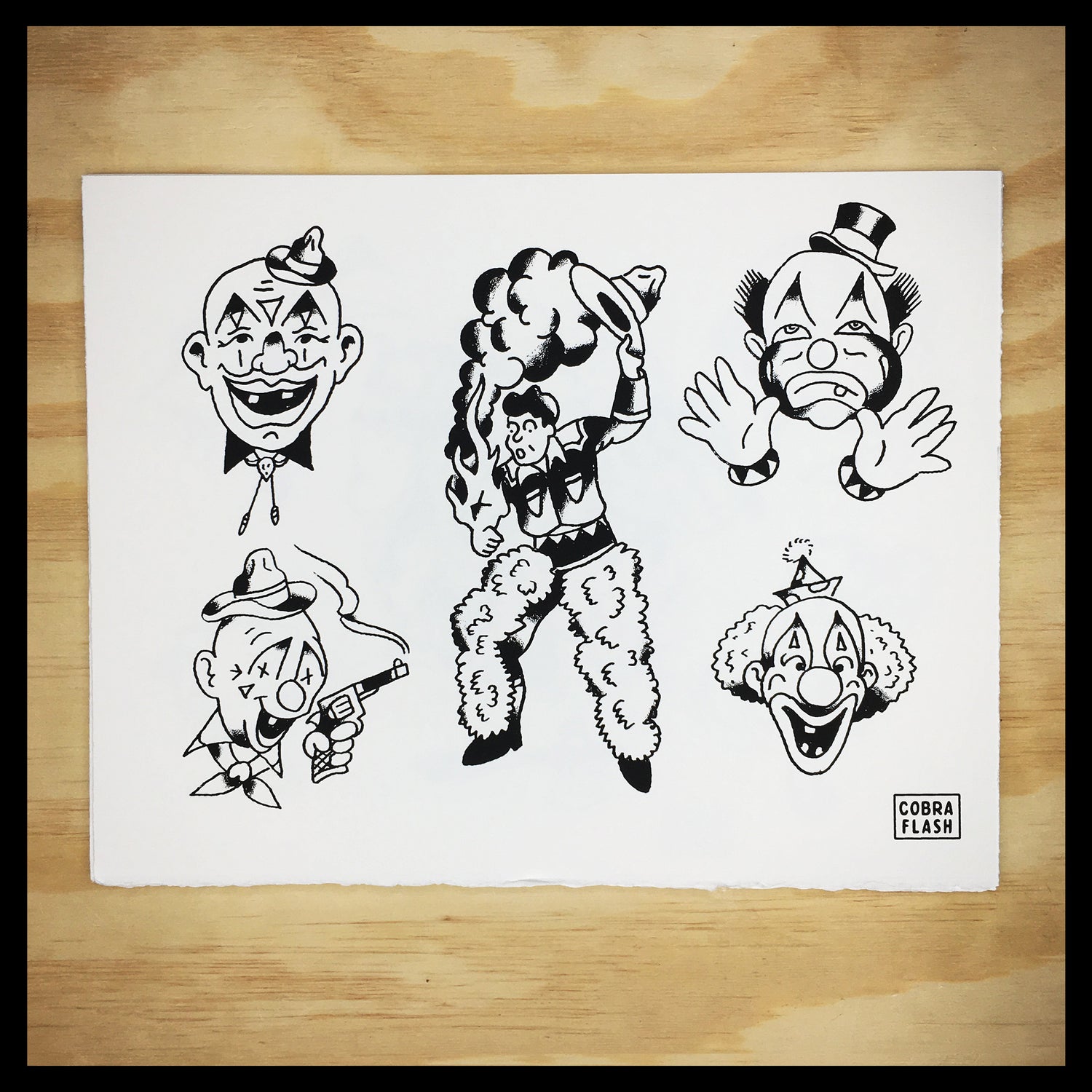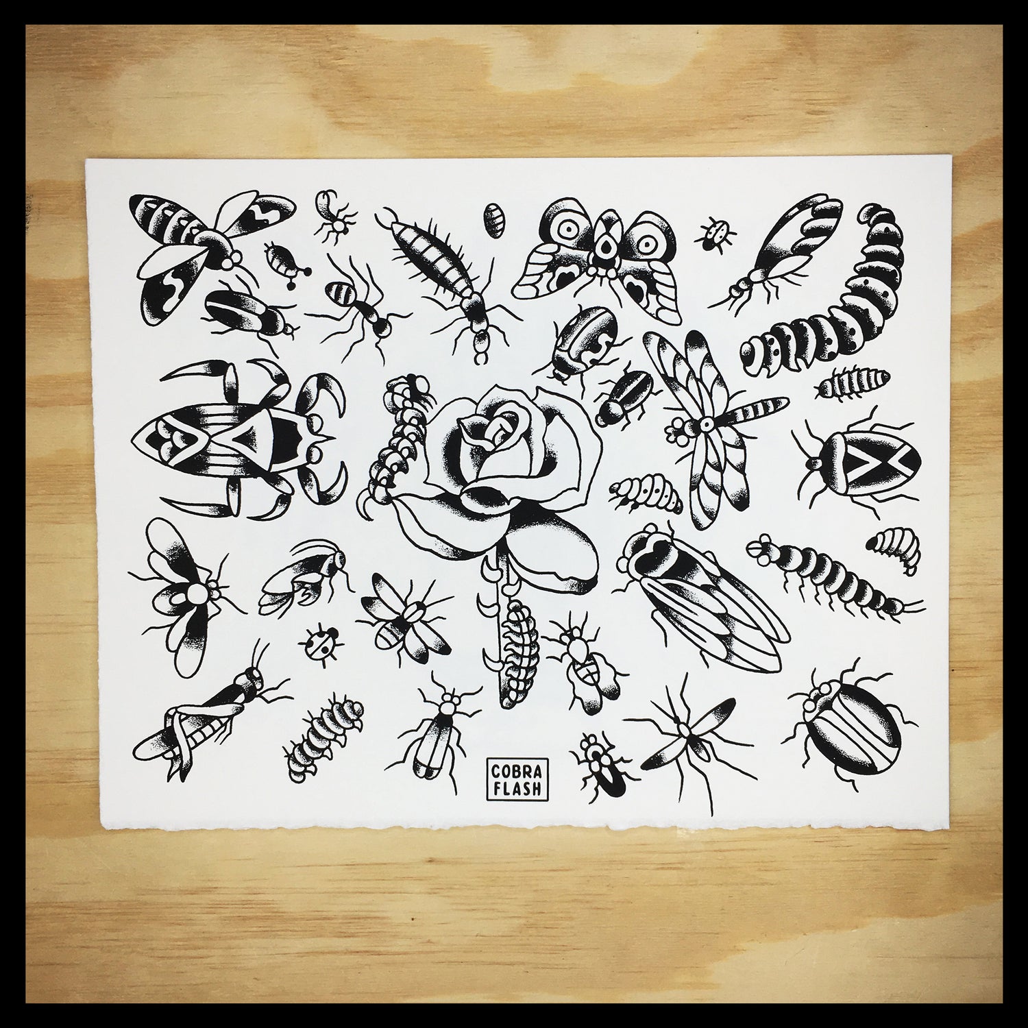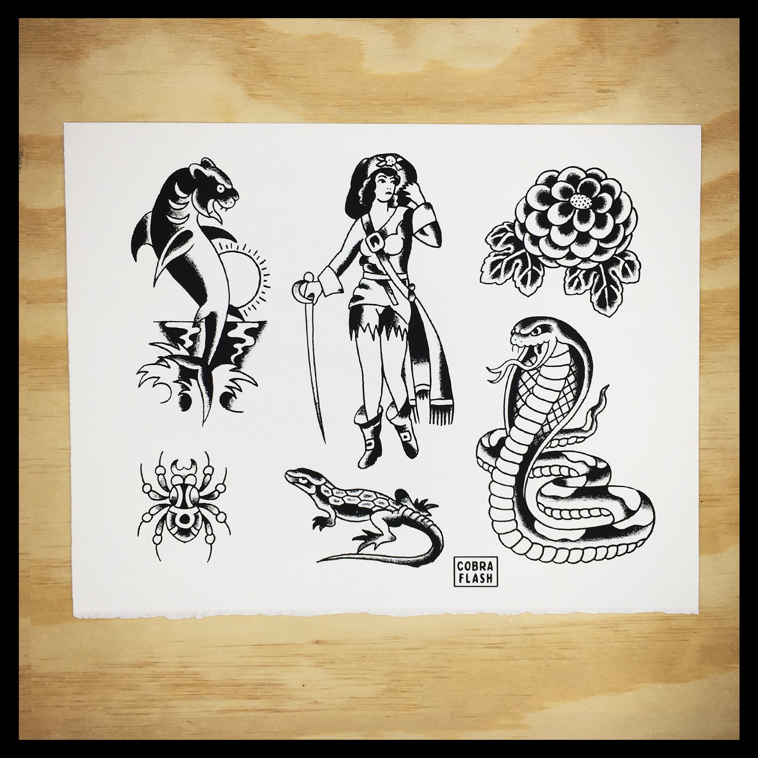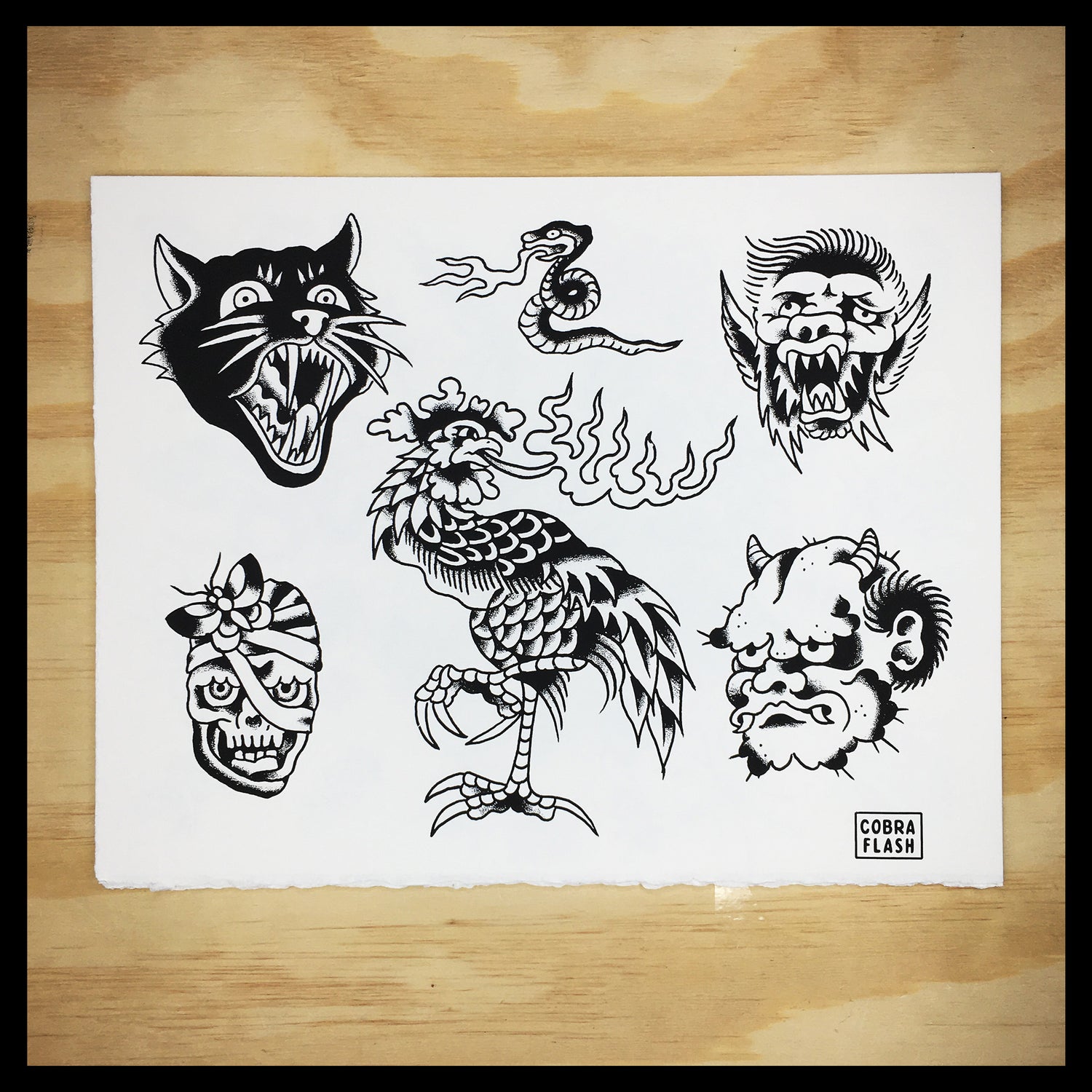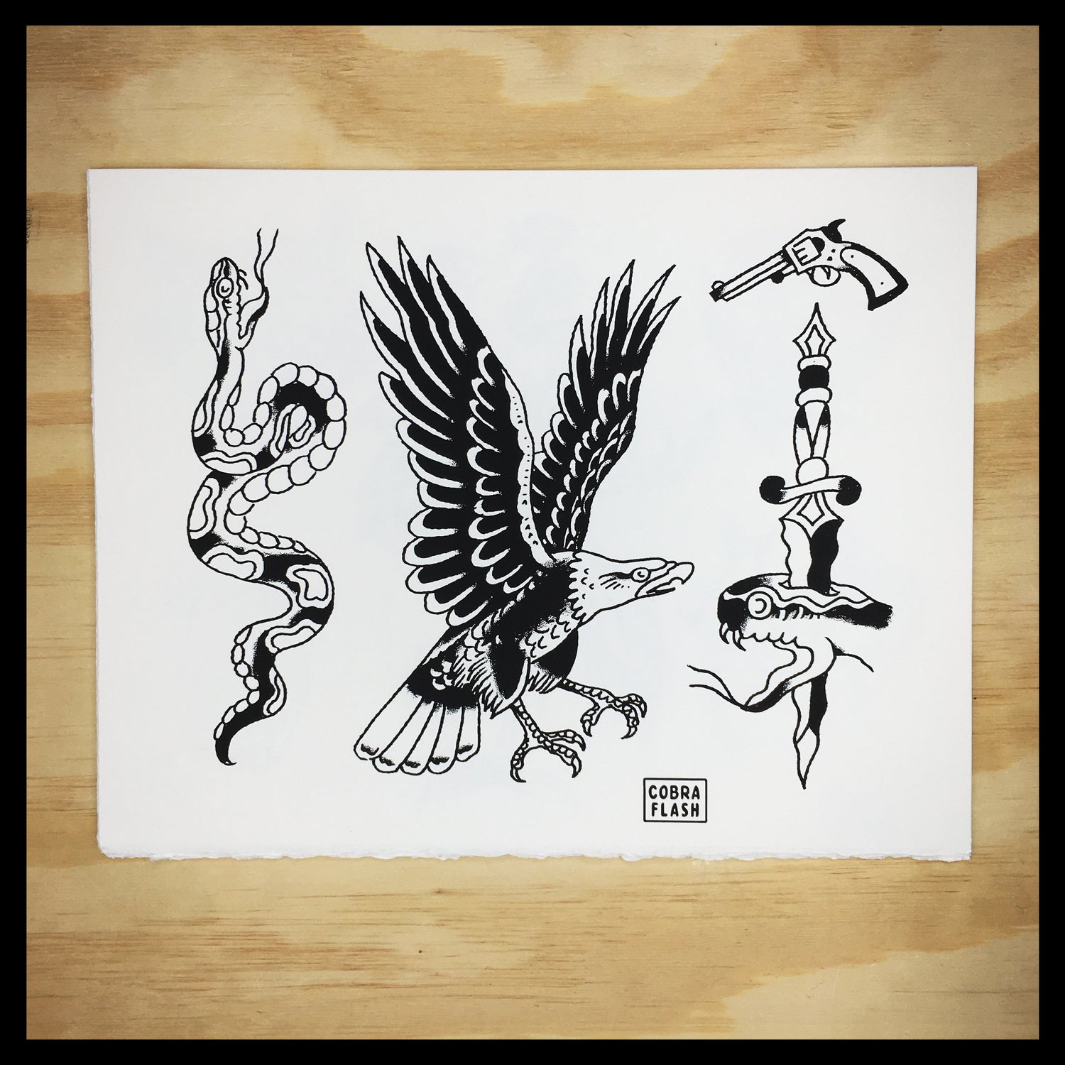 Each Set of Cobra Flash comes with six sheets of flash. Three designed by Timmy Tatts and three designed Lowercase j. Each sheet is an 11x14" hand-pulled screenprint on BFK Rives 250 gram, fine printmaking paper.