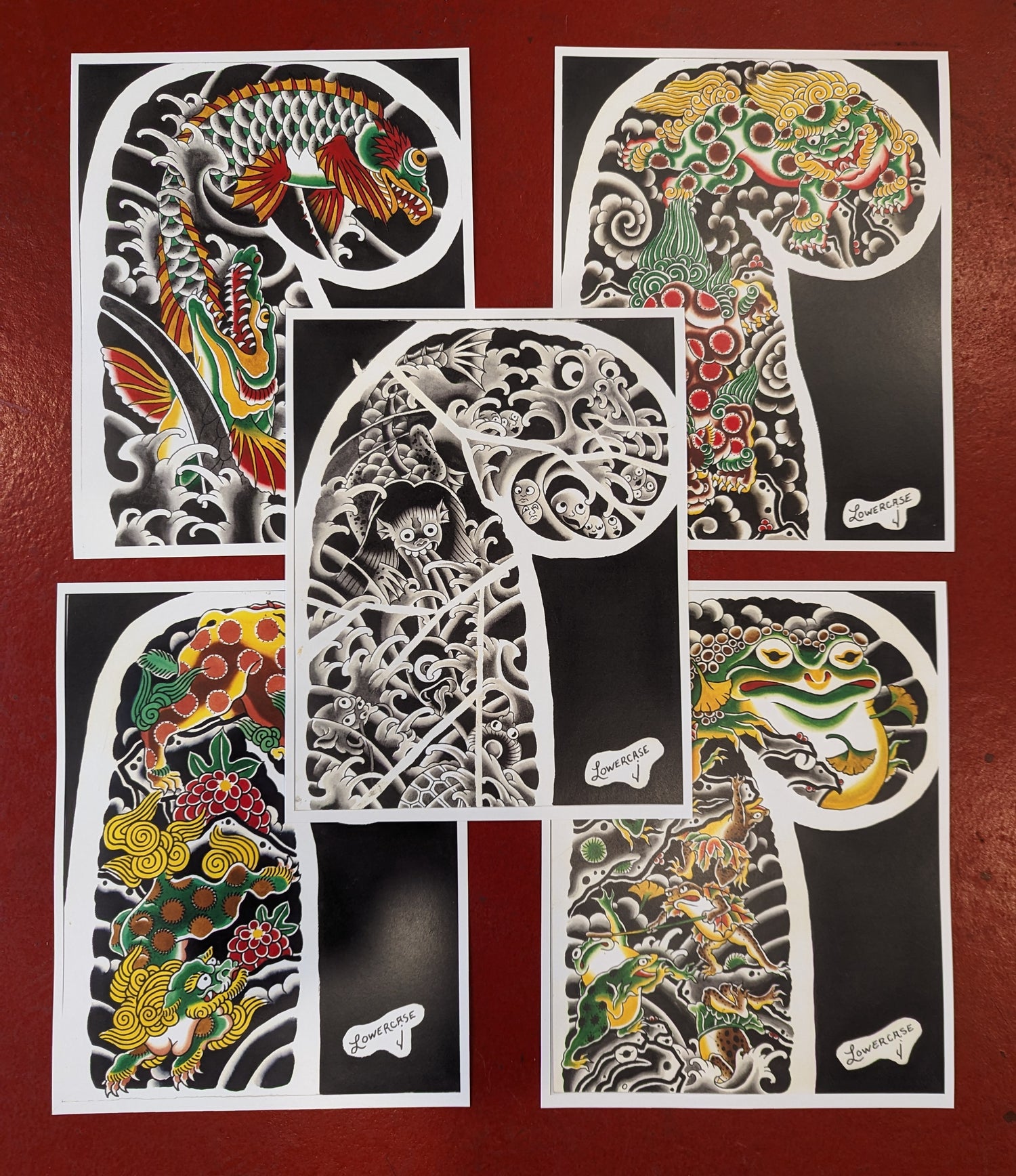 Here's a Japanese style set of five prints by Lowercase j. Great for tattooing on people or sprucing up the old shop or apartment. A lot of shops don't have flash on the wall anymore. What's up with that? 11"x14"