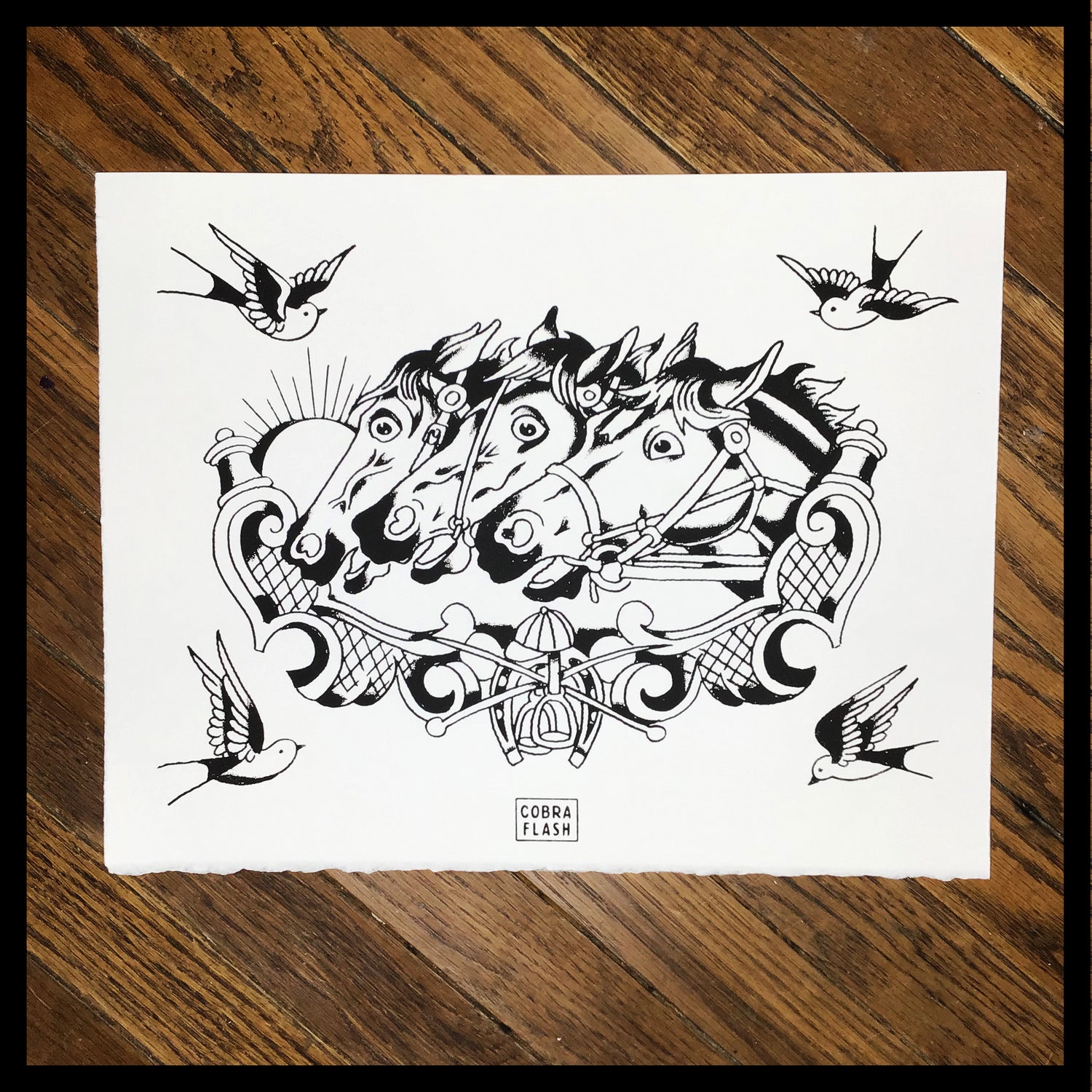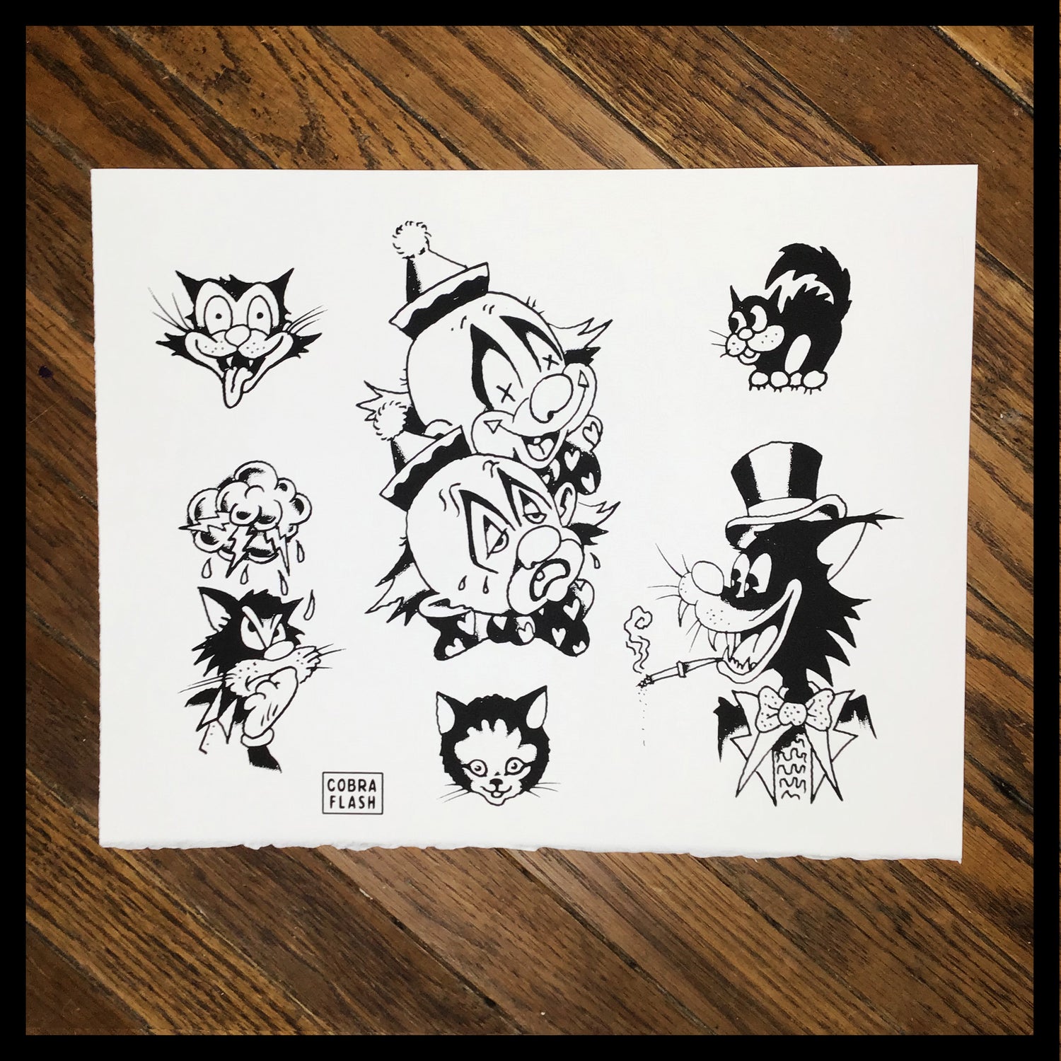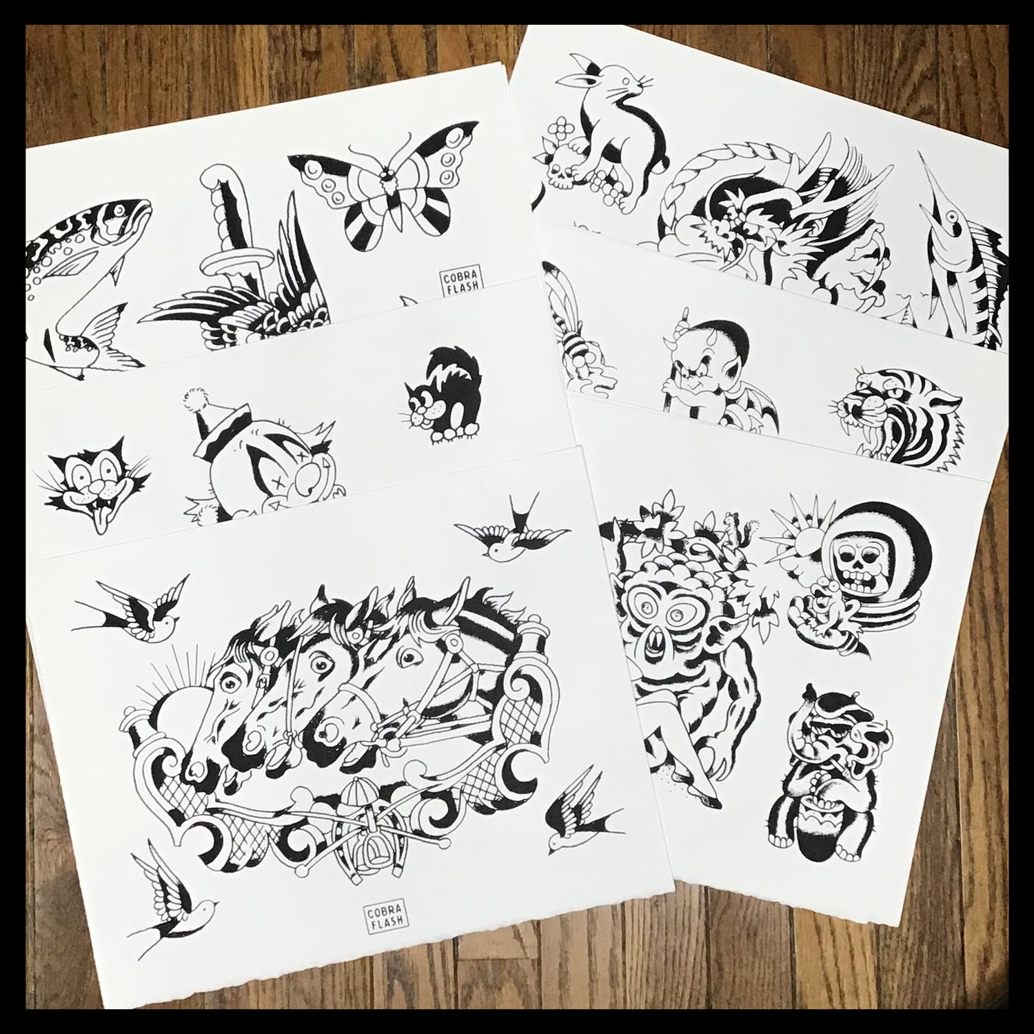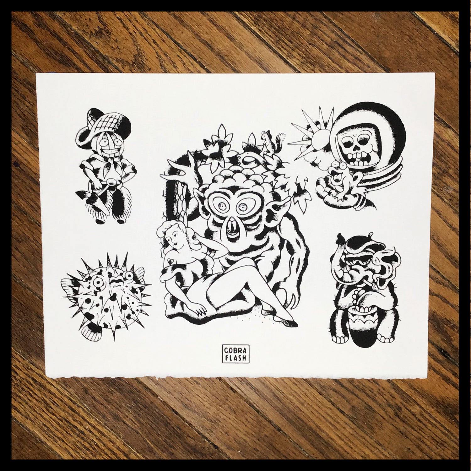 Each Set of Cobra Flash comes with six sheets of flash. Three designed by Timmy Tatts and three designed Lowercase j. Each sheet is an 11x14" hand-pulled screenprint on BFK Rives 250 gram, fine printmaking paper.